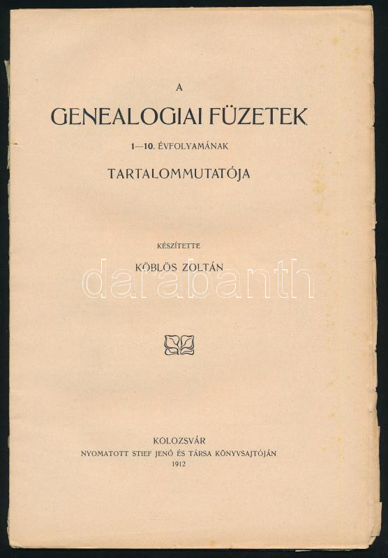 1911-1912 Geneaológia füzetek, családtörténeti folyóirat, szerk. Csikszentmihályi Sándor Imre, Kolozsvár, Stief Jenő és Tsa. Nyomdája, 1912, X. évf. 6. sz., IX. évf. ismeretlen szám (borító hiányzik) és I-X. évf. tartalommutatója. Részben felvágatlan, volt könyvtári példányok, részben hiányzó borítókkal.