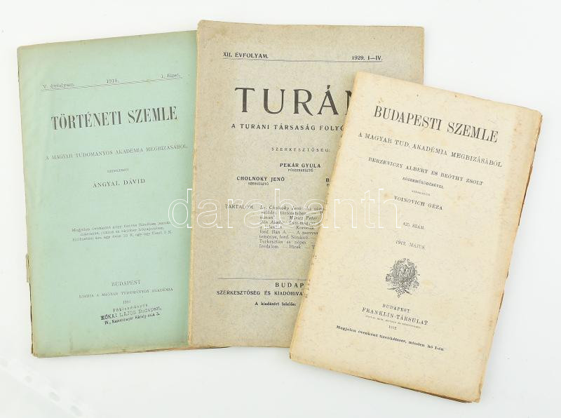 1912-1929 Vegyes nyomtatvány tétel, 3 db: 1929 Turán. A Turáni Társaság folyóirata. XII. évf. 1929. I-IV. Szerk.: Pekár Gyula, Cholnoky Jenő, Bán Aladár. Bp., Turáni Társaság,63+1 p.; 1912 Budapesti Szemle. 425. sz. 1912. május. Szerk.: Voinovich Géza, Berzeviczy Albert, Beöthy Zsolt. Bp., 1912, Franklin, aláhúzásokkal, 161-320 p. 1916 Történeti Szemle. V. évf. 1. füzet. Szerk.: Angyal Dávid. Bp., 1916, MTA, 160 p.