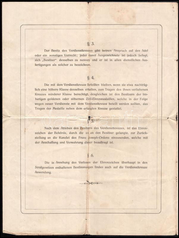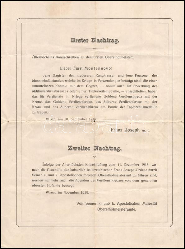 Description: 1914 Statuten für das mit Allerhöchster Entschliessung vom 16. Februar 1850 gegründete Verdienstkreuz. / Az 1850. február 16-i határozattal alapított Érdemkereszt alapszabálya, függelékekkel, a kitüntetések ábrázolásával. Hajtott, részben kissé foltos, koszos, 4 p.