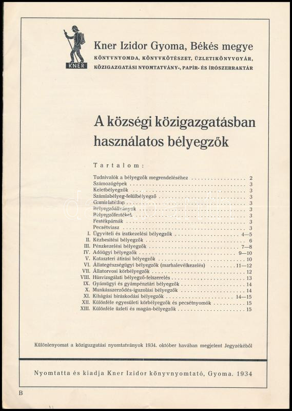 Description: 1934 A községi közigazgatásban használatos bélyegzők. (Különlenyomat a közigazgatási nyomtatványok 1934. október havában megjelent jegyzékéből). Gyoma, Kner Izidor, 16 p. Tűzött papírkötés, középen hajtott, jó állapotban.