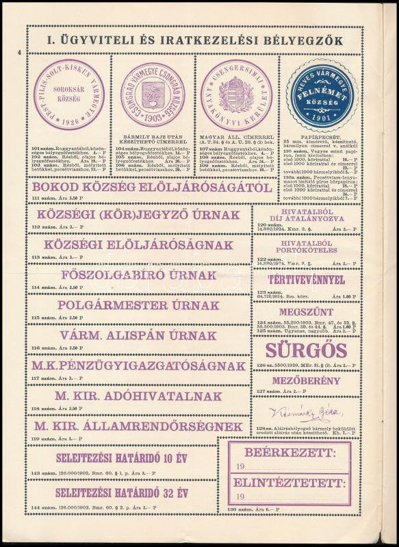 1934 A községi közigazgatásban használatos bélyegzők. (Különlenyomat a... https://www.darabanth.com/en/435-Online-auction/435.0/Art-and-other-collectibles/Printed-Materials~2000003/1934-A-kozsegi-kozigazgatasban-hasznalatos-belyegzok-Kulonlenyomat-a-kozigazgatasi-nyom~II2820135