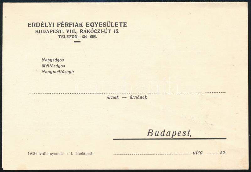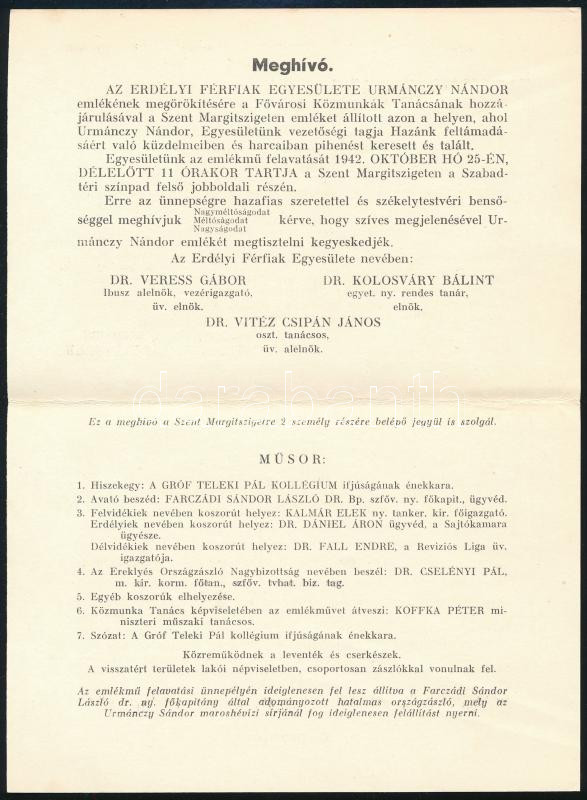 1942 Az Erdélyi Férfiak Egyesületének meghívója Urmánczy Sándor emlékt...