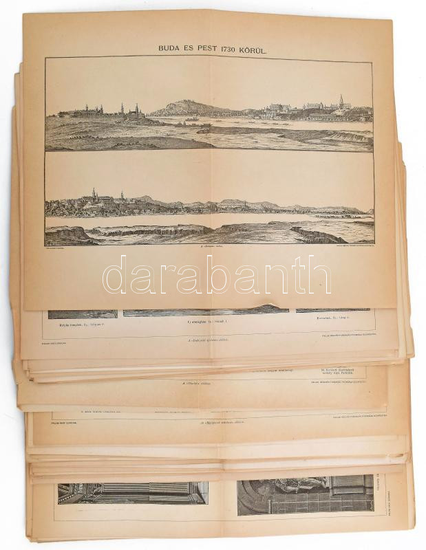 cca 1895-1900 kb. 50 db Budapest, művészet, történelem témájú illusztráció (Buda és Pest 1730 körül, Budapesti épületek I.-III., Budapesti szobrok, magyar díszítmények I. és III., magyar agyagáruk gyári bélyegei, ezredéves kiállítás I.-III., magyar érmek stb.) a Pallas Nagy Lexikonából, néhány kevés sérült, 23,5x30 cm,