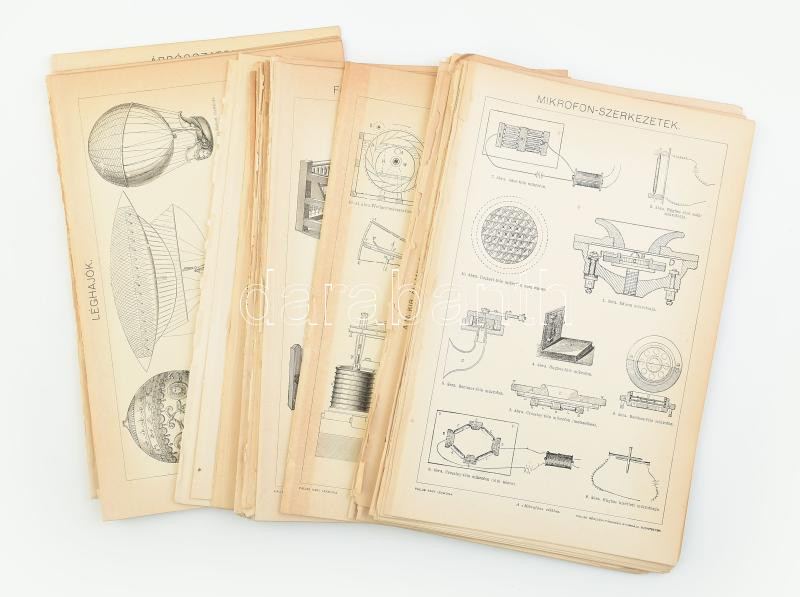 cca 1895-1900 kb. 70 db tudomány, technika, közlekedés, militária, építészet témájú illusztráció (Budapesti Margithíd, léghajózás, Óbudai emelőhíd, stb.) a Pallas Nagy Lexikonából, néhány kevés sérült, 24x16 cm,