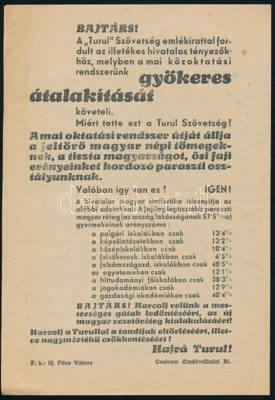 cca 1930 A Turul Szövetség röplapja a magyar parasztság részvételéért ...