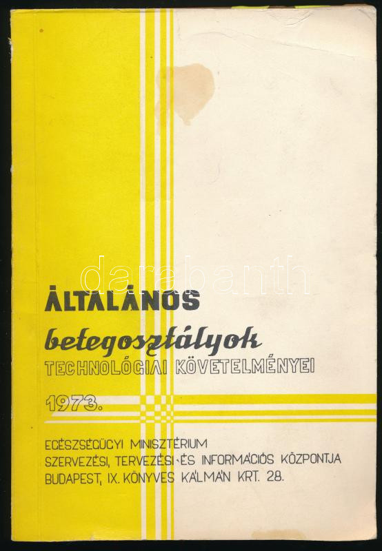 Description: Általános betegosztályok technológiai követelményei 1973. Bp., 1973., Egészségügyi Minisztérium Szervezési, Tervezési- és Információs Központja, 102 p.+59 t. Kiadói papírkötés, kissé kopott borítóval. Megjelent 350 példányban.