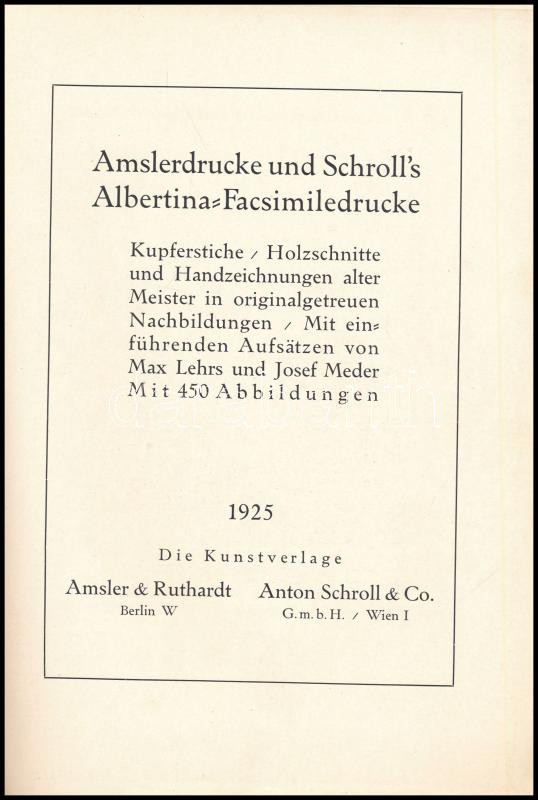 Amslerdrucke und Schroll's Albertina-Facsimiledrucke. Berlin-Wien, 1925, Amsler & Ruthardt - Anton Schroll & Co. Számos fekete-fehér reprodukcióval illusztrálva. Német nyelven. Kiadói papÃrkötés, kissé foltos borÃtóval.