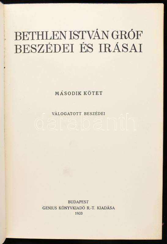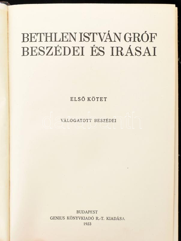 Bethlen István gróf beszédei és írásai. I-II. kötet. Bp.,1933, Genius,... https://www.darabanth.com/en/435-Online-auction/435.0/Books/Books-History~2000008/Bethlen-Istvan-grof-beszedei-es-irasai-I-II-kotet-Bp-1933-Genius-1-tplus368-p-380-p-Ki~II2782683