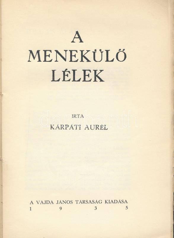 Kárpáti Aurél: A menekülő lélek. Bp., 1935, Vajda János Társaság, 174+... https://www.darabanth.com/en/435-Online-auction/435.0/Books/Books-Other-rarities~2000022/Karpati-Aurel-A-menekulo-lelek-Bp-1935-Vajda-Janos-Tarsasag-174plus2-p-Elso-kiadas~II2812601