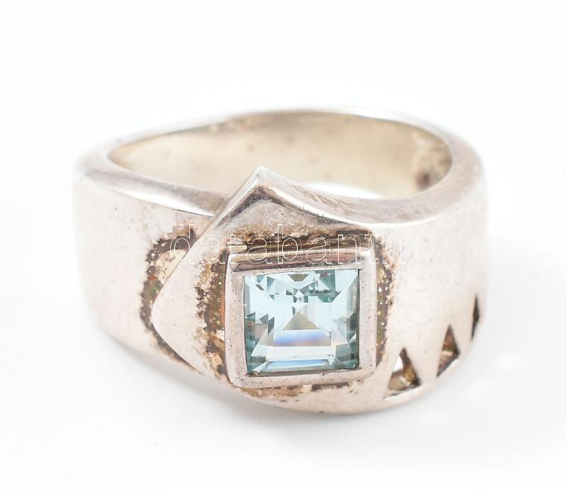 Ezüst (Ag) gyűrű világoskék kővel. Jelzett, kis kopással, bruttó: 7,2 g, m: 58