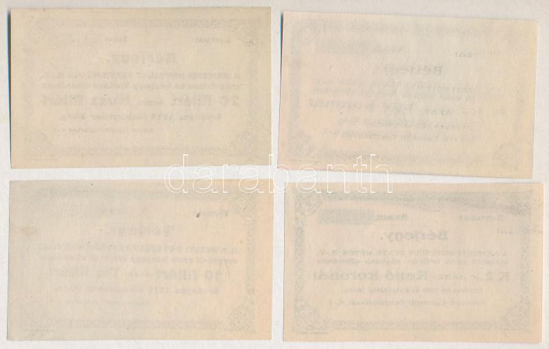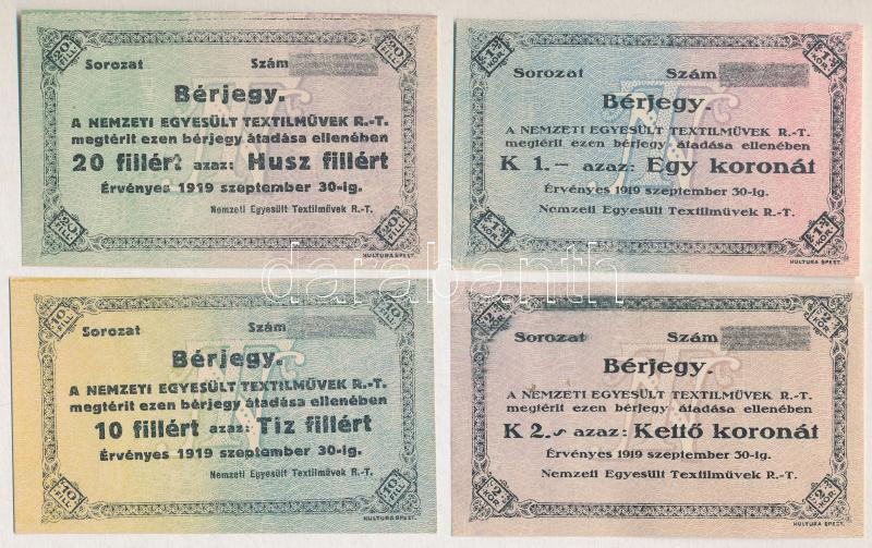 Budapest 1919. 10f "Nemzeti Egyesült Textilművek R.T. - Bérjegy" + 20f "Nemzeti Egyesült Textilművek R.T. - Bérjegy" + 1K "Nemzeti Egyesült Textilművek R.T. - Bérjegy" + 2K "Nemzeti Egyesült Textilművek R.T. - Bérjegy" kitöltetlen! 2mm T:I Adamo BUC188