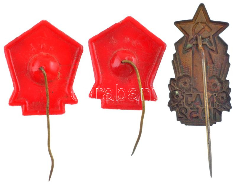 Description: 1952. "1 Máj 1952" részben festett bronz május elsejei lemezjelvény (38x20mm) + 1954. "1 Máj 1954" részben festett, vörös színű bakelit(?) május elsejei jelvény (2x) (29x24mm) T:1-,2