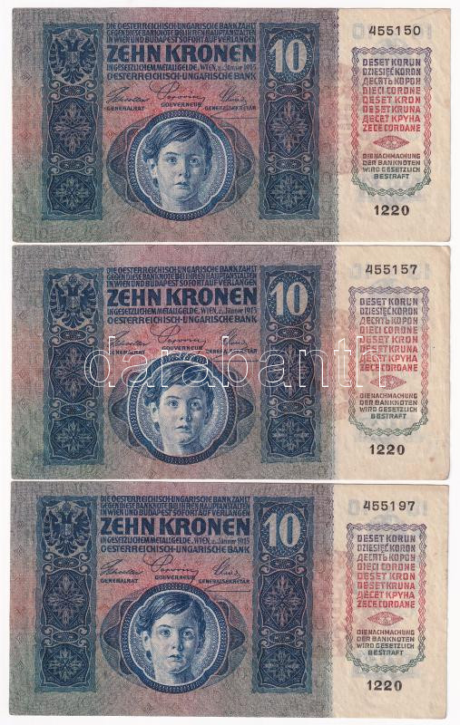 1915. 10K (2x) "1220 455150", "1220 455157", "1220 455197", mindegyik piros "MAGYARORSZÁG" felülbélyegzéssel T:III szép papír Adamo K11