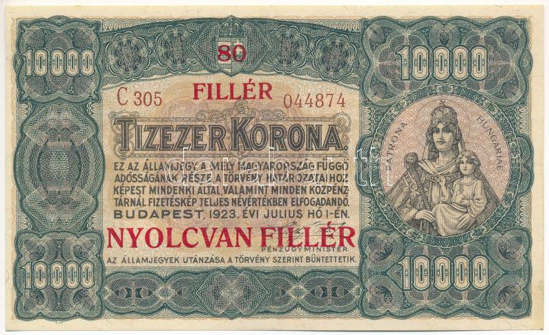 1923. 10.000K felülbélyegezve "80 fillér - Nyolcvan fillér", nyomdahely jelölés nélkül, "C 305 044874" T:II Hungary 1923. 10.000 Korona with "80 fillér - Nyolcvan fillér" overprint, without printer's mark "C 305 044874" C:XF Adamo K42/2