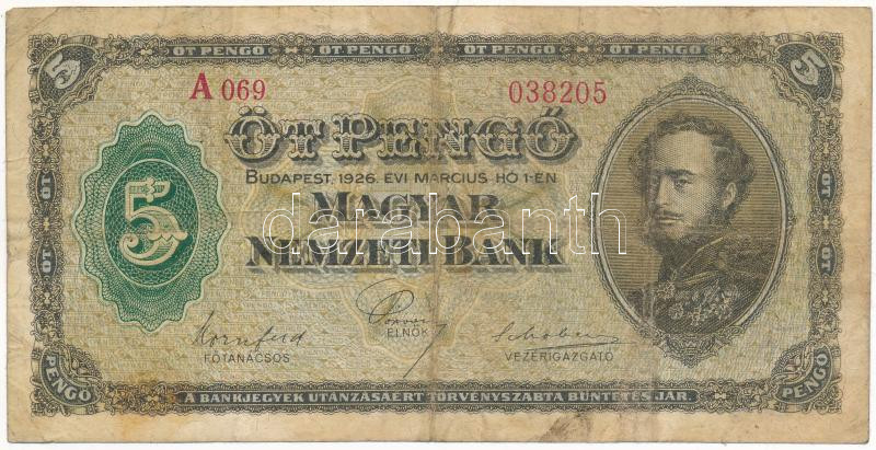 https://www.darabanth.com/en/435-Online-auction/435.0/Numismatics/Hungarian-Banknotes~1000007/1926-5P-A-069-038205-TIII-III--Hungary-1926-5-Pengo-A-069-038205-CF-VG-Adamo-P3~II2815189