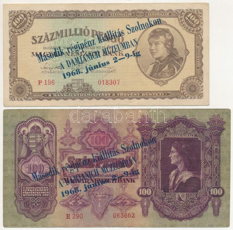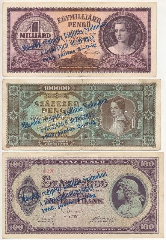 1930. 100P + 1945. 100P + 1945. 100.000P + 1946. 100.000.000P + 1946. 1.000.000.000P mind "Második Régipénz Kiállítás Szolnokon a Damjanich Múzeumban 1968. június 2-9-ig" felülbélyegzéssel T:III Adamo FO35.2.3, FO35.2.5, FO35.2.12, FO35.2.15, FO35.2.16