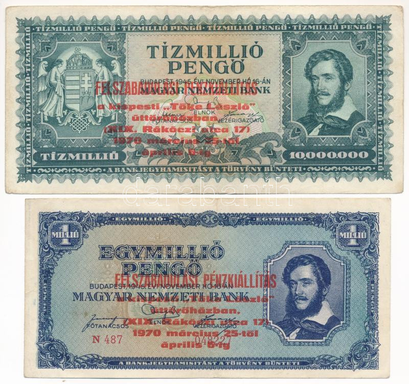 1946. 1.000.000P + 1945. 10.000.000P + 1946. 100.000.000P + 1946. 1.000.000.000P mind "Felszabadulási pénzkiállítás a kispesti Tőke László úttörőházban 1970 március 25-től április 6-ig" felülbélyegzéssel T:III Adamo FF4.1.1, FF4.1.2, FF4.1.3, FF4.1.4