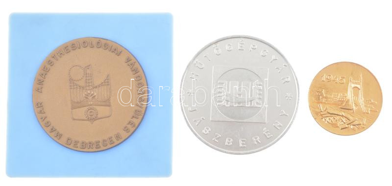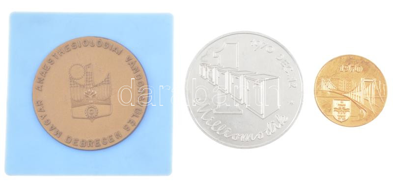 1970. "Hűtőgépgyár - Jászberény / 1 Milliomodik 1970. dec. 12." kétoldalas Al emlékérem (65mm) + 1970 "Erzsébet híd" kétoldalas fém emlékérem (40mm) + DN Magyar Anaesthesiológiai Vandorgyűlés, Debrecen" műanyag plakett (62mm) T:1-
