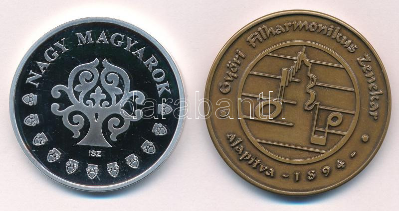 Description: Ligeti Erika (1934-2004) 2001. "A Richter János Hangversenyterem avatásának emlékére / Győri Filharmonikus Zenekar" kétoldalas bronz emlékérem kapszulában (42mm) + ifj. Szlávics László (1959-) 2011. "Nagy Magyarok / Liszt Ferenc 1811-1886" ezüstözött Cu emlékérem kapszulában (40mm) T:1,PP