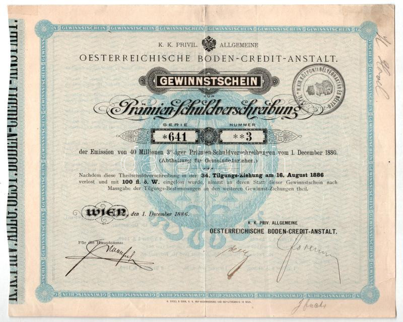 Austria / Wien 1886. "Österreichische Boden-Credit-Anstalt - Gewinnstschein" premium bond about 100 Austrian Florin C:F doodle, taped, stapler holes