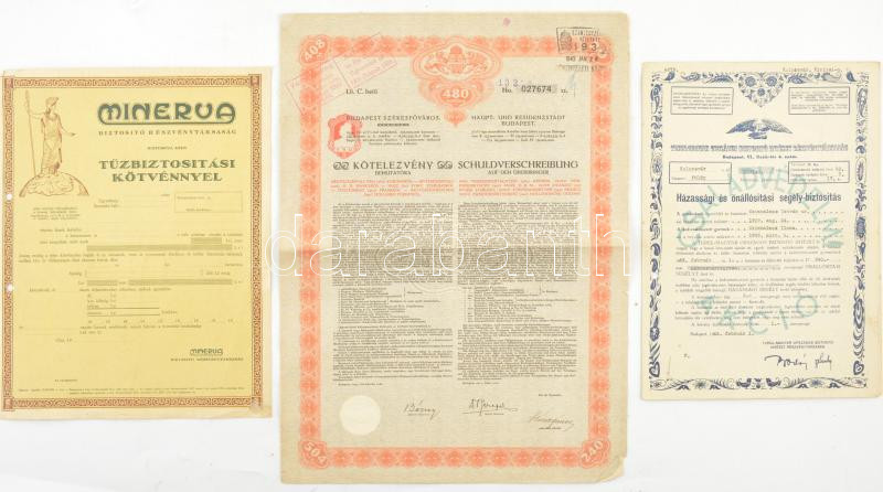 Description: Budapest 1914. "Budapest Székesfőváros - Kötelezvény" 480K-ról szárazpecséttel, bélyegzésekkel és szelvényekkel + Budapest 1942. "Turul-Magyar Országos Biztosító Intézet Részvénytársaság" házassági és önállósítási segély-biztosítás + Románia / Kolozsvár ~1930. "Minerva" kitöltetlen tűzbiztosítási kötvény T:III