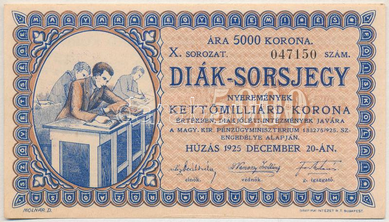Budapest 1925. "Diák-Sorsjegy" 5000K értékben, "X. sorozat, 047150" T:I