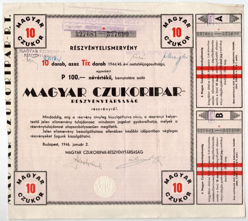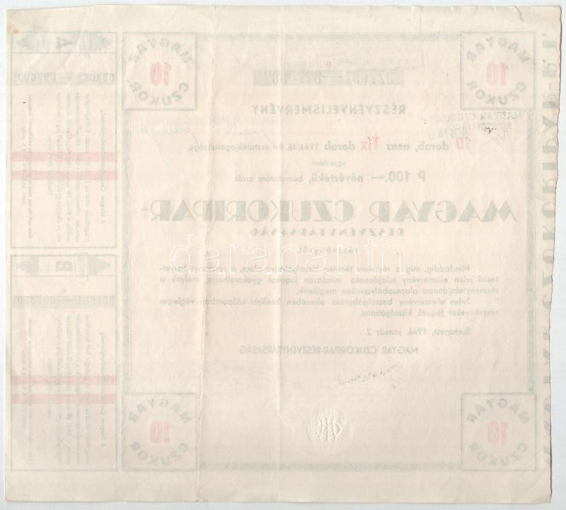 https://www.darabanth.com/en/435-Online-auction/435.0/Numismatics/Shares-and-Tickets~1000005/Budapest-1946-Magyar-Czukoripar-Reszvenytarsasag-reszvenyelismerveny-100P-neverteku-~II2816217