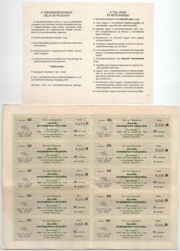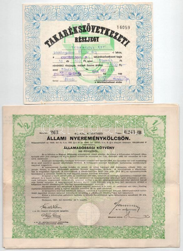 Budapest 1946. "Magyar Czukoripar - Részvénytársaság" részvényelismervény 100P névértékű részvényről szárazpecséttel, felülbélyegzésekkel, szelvényekkel + Budapest 1941. "4%-kal kamatozó állami nyereménykölcsön - államadóssági kötvény" 100P-ről szárazpecséttel, szelvényekkel + 1994. "Takarékszövetkezeti Részjegy" T:II,III