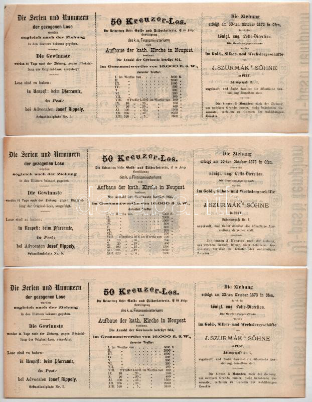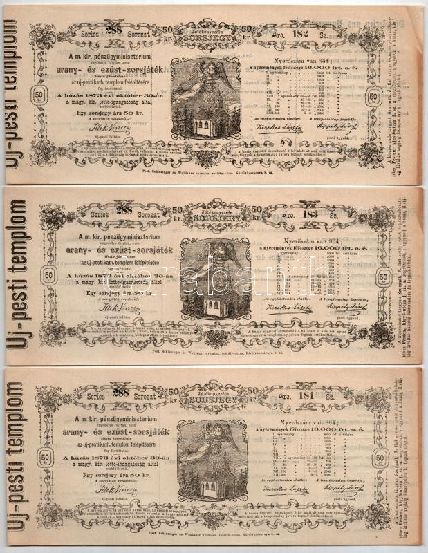 Description: Budapest / Pest 1873. "Jótékonyczélú Sorsjegy - Az uj-pesti kath. templom felépítésére" 50kr értékű sorsjegy (3x) sorszámkövetők "181-183" T:I- kis szamárfül és szakadás