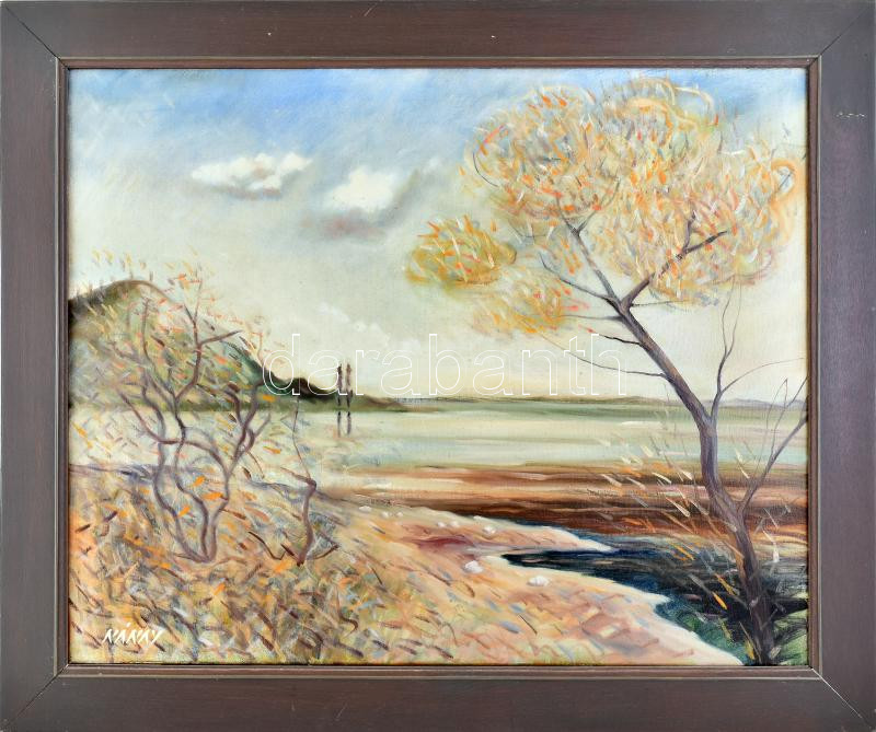 Description: Nánay Szilamér (1952-): Holnap a csúcsra indulunk. Olaj, vászon, jelzett, hátoldalán Képcsarnok Vállalat kissé töredékes címkéjével, mely szerint szerepelt a Paál László Terem, Budapest, 1987-ben rendezett kiállításon és a művész saját címkéjén autográf felirattal. Dekoratív fakeretben, 60×75 cm