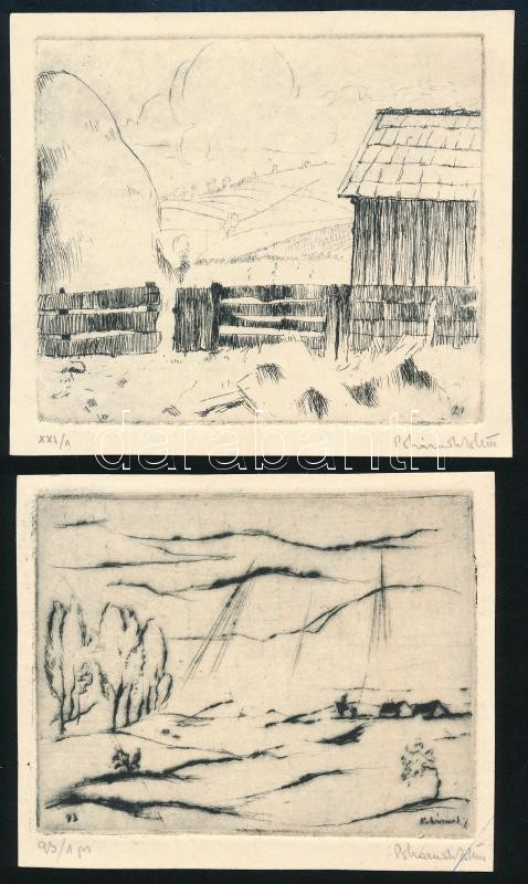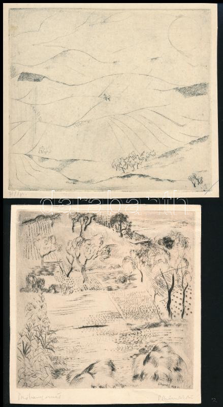 Pohárnok Zoltán (1905-1976): 4 db tájkép. Rézkarc, papír, egy kivételével jelzett. Egyik kissé gyűrött. 7,5x9,5 és 12x13,5 cm közötti méretekben.