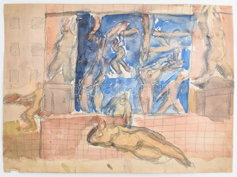 Román György (1903-1981): Népfürdő. Akvarell, ceruza, papír, hátoldalán Román György Alapítvány bélyegzőjével. Lapszéli szakadásokkal. 35,5x48 cm.