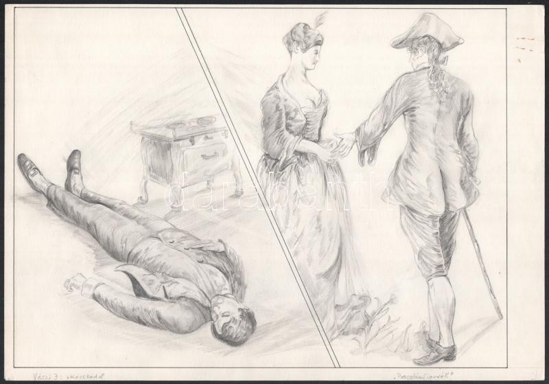 Description: Várady Róbert (1950-): 6 db illusztráció Vészi Endre verseihez. Ceruza, papír. Jelzés nélkül, 3 db lap a művész nevével feliratozott. Lapméret: kb. 30x21 cm. Az Igazság c. lapnak készült rajzok.