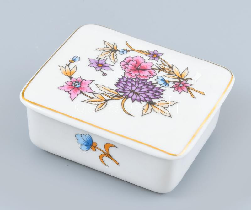 Hollóházi virágmintás bonbonier, kis kopásokkal, jelzett, 8x9 cm