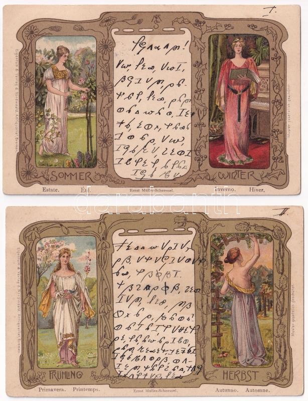 Description: 2 db RÉGI (1901 előtti) szecessziós litho művészlap hölgyekkel: Nyár-Tél, Tavasz-Ősz (titkosírással írt lap) / 2 pre-1901 Art Nouveau litho lady art postcards: Summer-Winter, Spring-Fall (with cryptography)