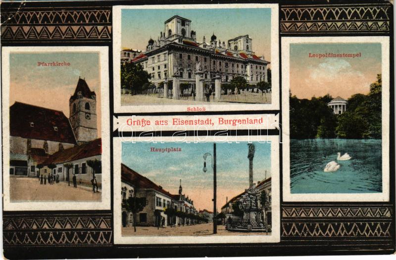 Kismarton, Eisenstadt; Pfarrkirche, Schloss, Hauptplatz, Leopoldinentempel / Plébánia templom, kastély, Fő tér, templom / church, castle, main square. Josef Popper 1019. 1926. Art Nouveau (EK)