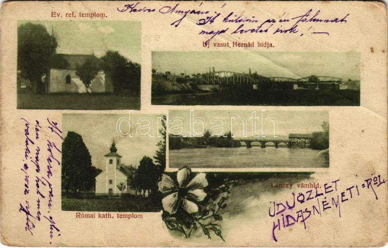 1909 Hidasnémeti, református és római katolikus templom, Lánczy vámhíd...