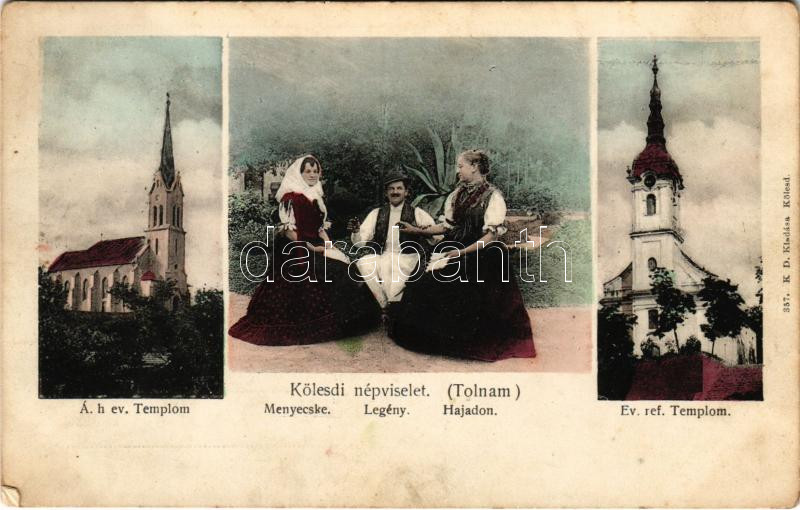 1910 Kölesd, Evangélikus templom, Református templom, Kölesdi népviselet (Tolna megye), Menyecske - legény - hajadon. K.D. 357. (fl)