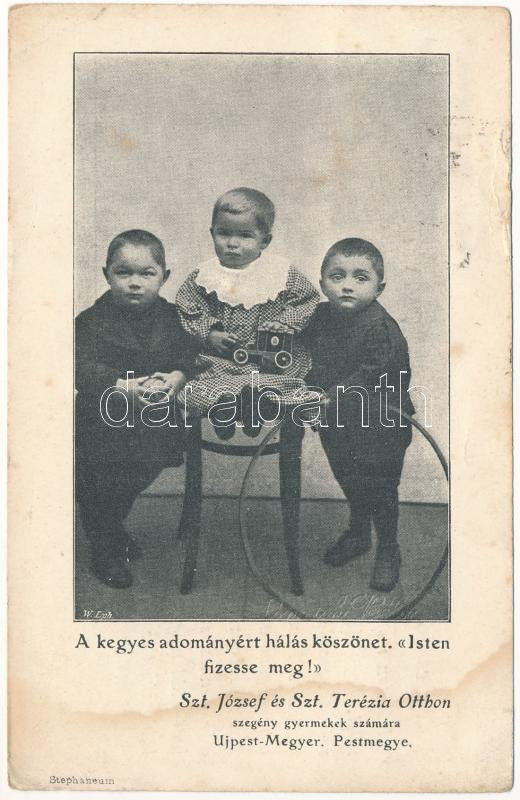 Description: 1924 Budapest IV. Újpest, Újpest-Megyer; Szent József és Szent Terézia Otthon szegény gyermekek részére adománygyűjtő lapja, néhány gyermek az otthonból, "Isten fizesse meg" (fl)