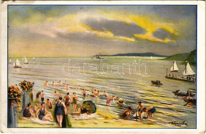 Balaton, Turisztikai reklámlap, fürdőzők. Magyar Királyi Államvasutak Igazgatósága s: Wágner Géza (EK)