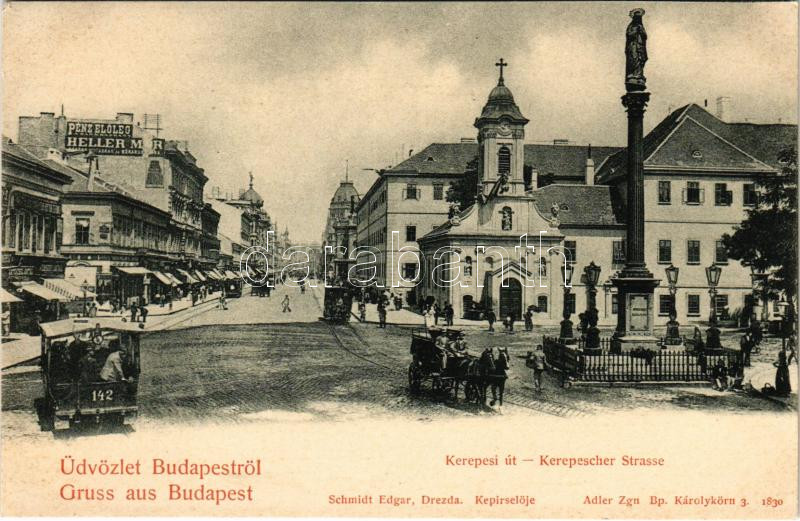 Budapest VIII. Kerepesi út (Rákóczi út), Rókus kórház, lóvasút, Heller M. üzlete reklámja. Schmidt Edgar 1830. (fa)