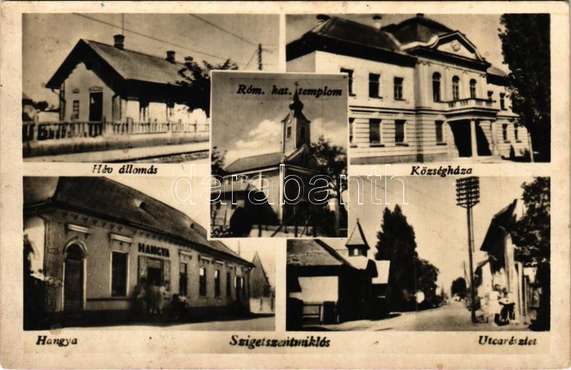 Szigetszentmiklós, községháza, utca részlet, HÉV (Helyiérdekű Vasút) állomás, vasútállomás, Római katolikus templom, Hangya szövetkezet üzlete (fl)