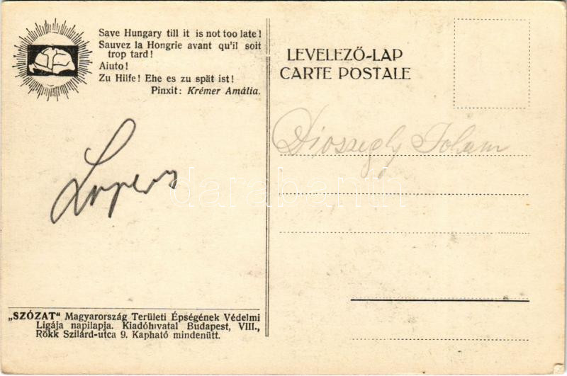 Description: Segítsetek míg nem késő! Kiadja a "Szózat" Magyarország Területi Épségének Védelmi Ligája napilapja / Hungarian irredenta propaganda, Treaty of Trianon s: Krémer Amália (EK)