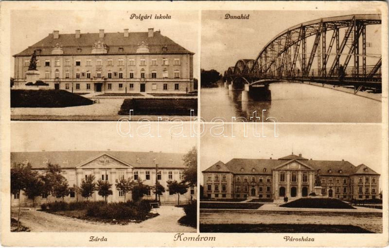 Komárom, Komárnó; Polgári iskola, Duna híd, zárda, városháza / school,...