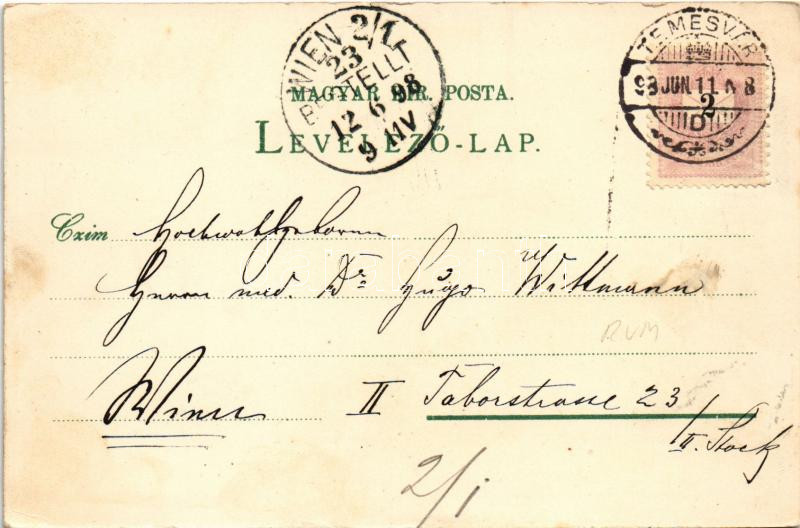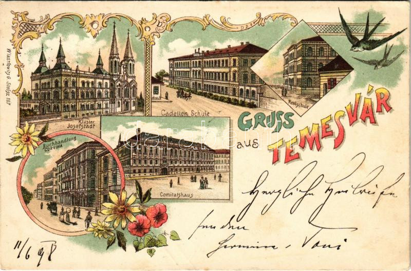 1898 (Vorläufer) Temesvár, Timisoara; Kloster Josefstadt, Cadetten Schule, Realschule, Buchhandlung Corvina, Comitatshaus / Józsefvárosi zárda, Osztrák-magyar hadapródiskola, Reáliskola, Corvina könyvkereskedés üzlete, Vármegyeháza / nunnery, K.u.K. military cadet school, school, bookstore, county hall. Wlaszlovits G. Art Nouveau, floral, litho (EK)