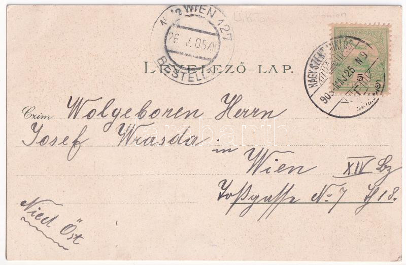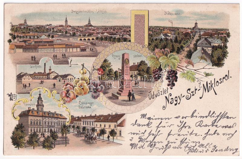 1905 Nagyszentmiklós, Sannicolau Mare; Náko utca, Sörfőzde, sörgyár, városháza, Czenzinger szálloda, Révay szobor / street, town hall, brewery, hotel, statue. O.Z.M. Art Nouveau, floral, litho (EK)