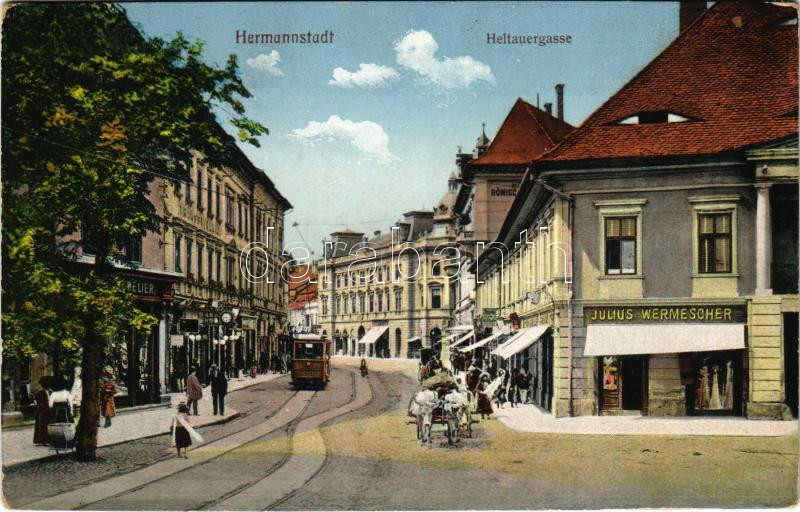 1914 Nagyszeben, Hermannstadt, Sibiu; Disznódi utca, villamos, Julius Wermescher üzlete, Római császár szálloda. G. A. Seraphin, Jos. Drotleff / Heltauergasse / street, shops, tram, hotel