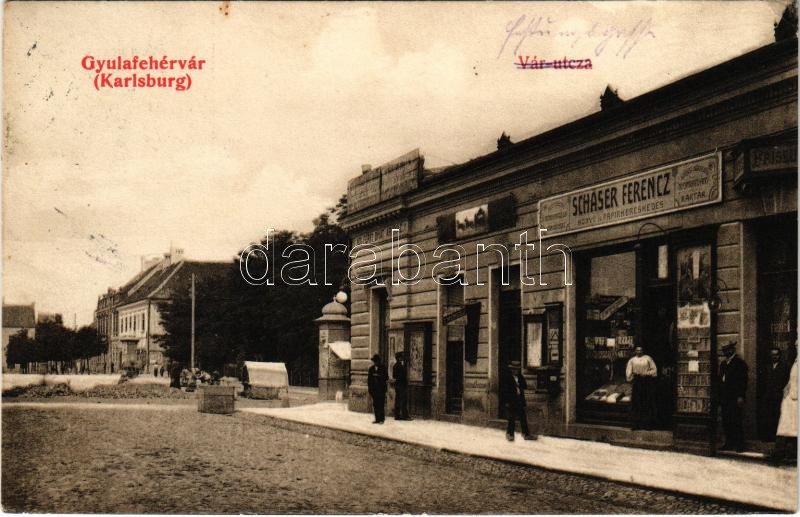 Description: 1915 Gyulafehérvár, Karlsburg, Alba Iulia; Vár utca, útépítés, női és férfi divatáruház, Schäser Ferenc könyv és papírkereskedés üzlete és saját kiadása / street, shops (EK)