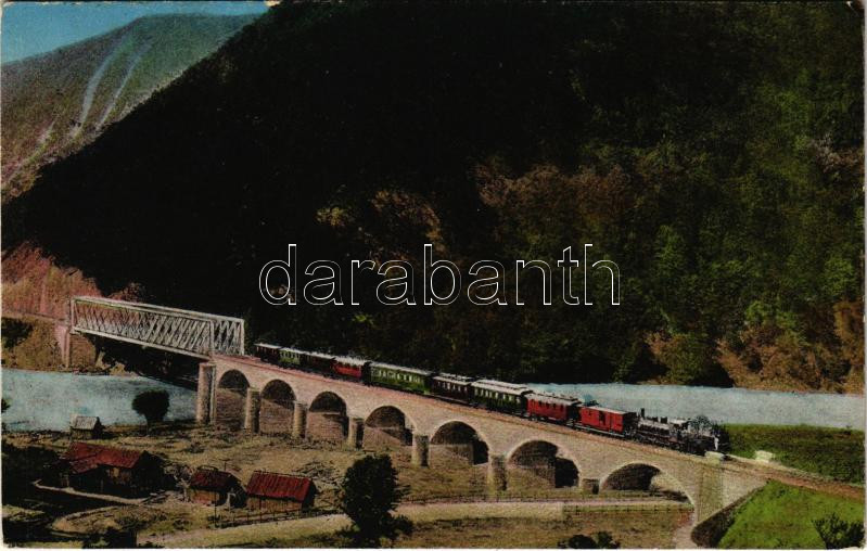 1915 Vöröstoronyi-szoros, Roterturmpass, Pasul Turnu Rosu (Nagyszeben, Sibiu); vasúti híd, vonat, gőzmozdony, határ / railway bridge, train, locomotive, border / Landesgrenze (EK)