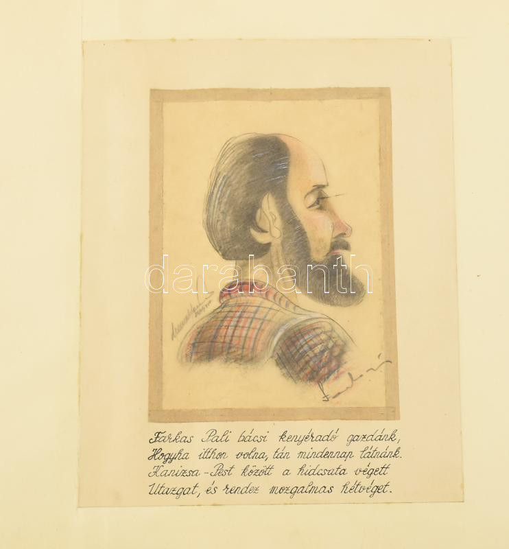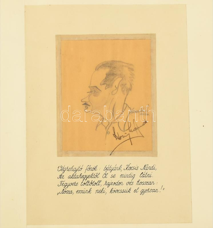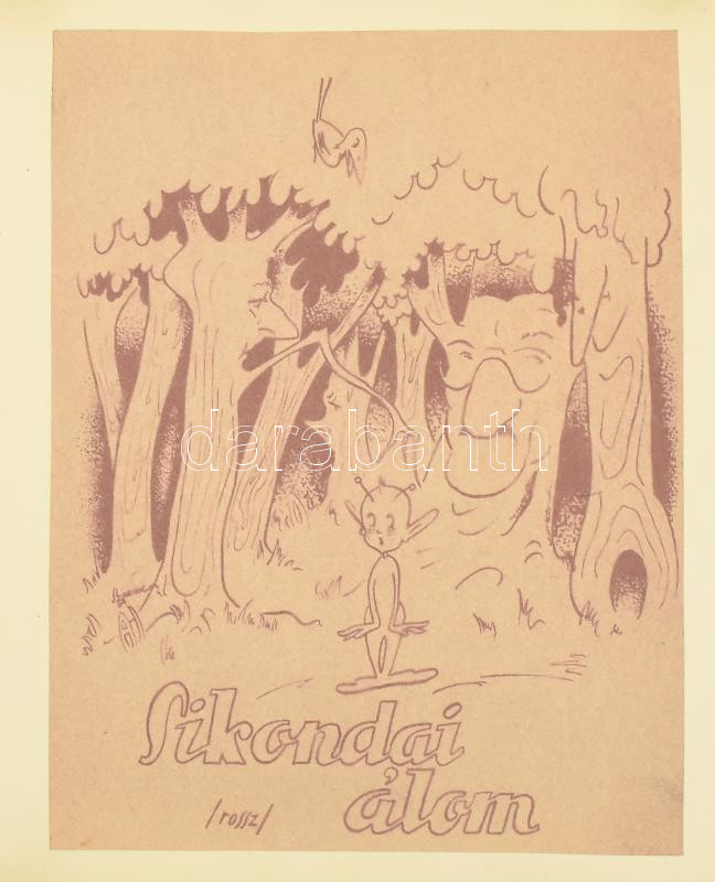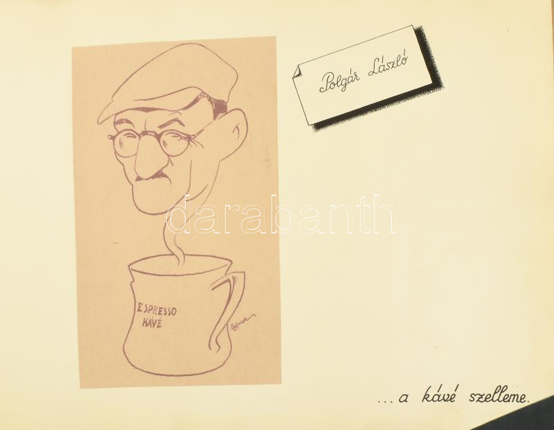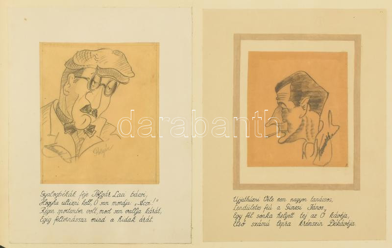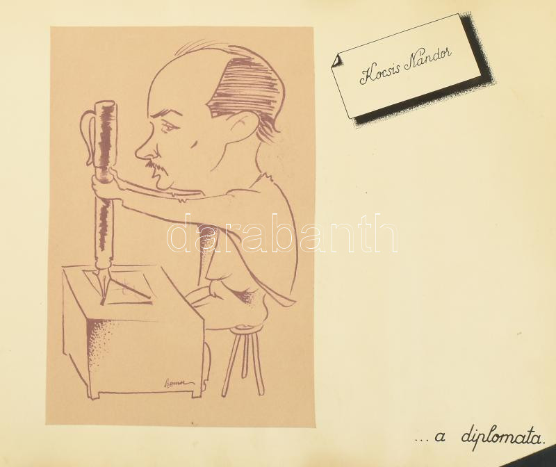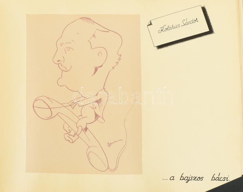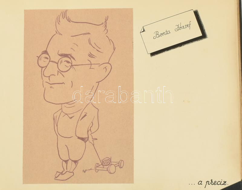 1949. Egyedi emlékkönyv. "Nagyrabecsülésünk jeléül a Déldunántúliak" "A sikondai gárda" Sok karikatúra, köztük nyomat, de sok egyedileg rajzolt jelzett is. A sikondai "gárda" tagjai: Kocsis Nándor, Farkas Pál, Polgár László, Bonta József, Bőviz László, Petrovics Gábor stb. Szép megkímélt kartonált bőr kötésben, sarkán Ezüst (Ag) monogramos dísz, fémjel nem található. 31x42 cm